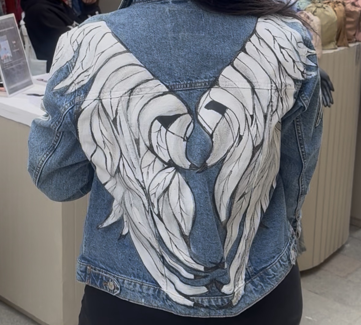Angel Feathers is a hand-painted wearable artwork, created on denim and finished with care as a moving canvas, painted by hand.