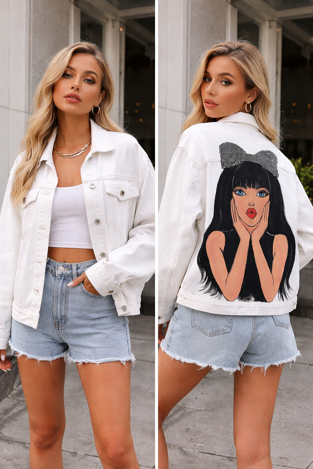 A statement white denim jacket featuring a bold, hand painted girl design and a signature rhinestone bow on the back. Effortlessly minimal in the front, striking from behind made to stand out.